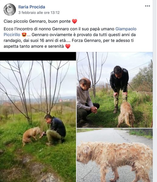 “La vita è proprio triste… chissà quanti ti avranno visto ed ignorato, tu così anziano e malato, chissà se ti avrà tenuto qualcuno in tutti questi anni e che poi ti ha abbandonato morente….. Questa sera caro Gennaro ci hai spezzato il cuore, so’ che posso parlare a nome di tutti coloro che hanno gioito per il tuo ritrovamento. Un forte abbraccio al tuo papà umano, Giampaolo, distrutto dal dolore. Grazie a tutti per l’affetto dimostrato a Gennaro, almeno non è morto da solo in strada come tanti altri. Gennaro ci ha dato un grande insegnamento, facciamone tesoro. Corri felice caro Gennarino, stasera in Paradiso c’è un pelosetto in più”.