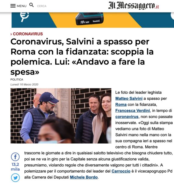 La foto, diffusa da ‘Il Messaggero’, ritrae Matteo Salvini in via del Tritone in compagnia della fidanzata. Se gli italiani stanno rispettando, con sacrificio, le misure restrittive, viene chiesto ai politici di dare il buono esempio e fare lo stesso.