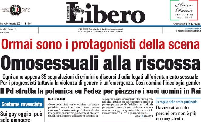 Sabato 1 maggio possiamo dire che è stato uno di quei giorni che hanno fatto la storia della tv e del web. Federico Lucia, in arte Fedez, ha sguainato la spada in difesa dei diritti LGBTQ+ e del DDL Zan. Il cantante milanese ha espressamente criticato la Lega e alcuni suoi politici per frasi omofobe pronunciate nel corso degli anni. Da lì a poco si è scatenata una lotta non solo la Rai, Fedez e la Lega ma anche contro i diritti gay. A quanto pare, per l’opinione pubblica, un giovane cittadino – apparentemente non coinvolto nell’argomento – non dovrebbe interessarsi e difendere la causa dei diritti di altri comuni cittadini. Il DDl Zan è una proposta di legge che intende difendere la comunità gay dall’omofobia, non toglierebbe del pane dal tavolo degli etero giusto? Eppure questa mattina sulla prima pagina di “Libero” c’è un titolone quanto più discriminatorio possibile contro gli omosessuali. “Ormai sono i protagonisti della scena. Omosessuali alla riscossa“.