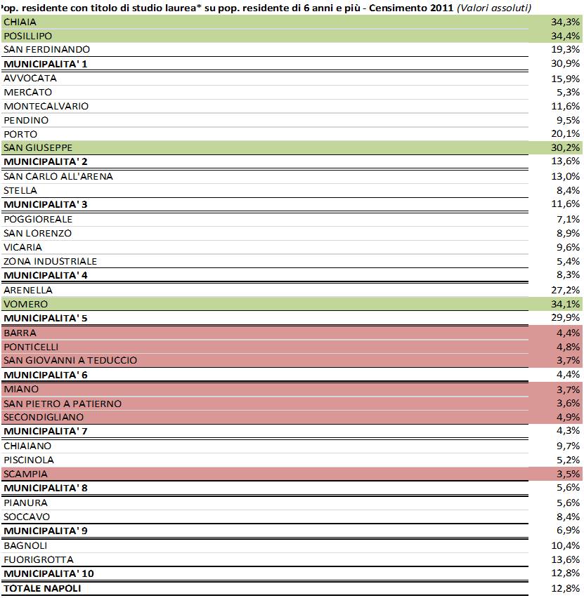 Nella tabella che segue sono evidenziate, dal Dottore di Ricerca all’Università di Teramo Pietro Sabatino, in verde i quartieri dove c’è la percentuale più alta di laureati napoletani. Si va dal 34,4% di Posillipo al 30% del quartiere San Giuseppe della prima municipalità. Statistiche ben diverse nelle periferie dove si va dal 3,5% di Scampia al 4,9% di Secondigliano. I dati in percentuale si riferiscono al numero totale dei residenti in quel determinato rione.