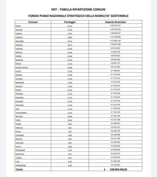 “Nella tabella di riparto dei fondi che il Ministero dei Trasporti ha assegnato ai comuni, nell’ambito del Piano Nazionale Strategico della Mobilità Sostenibile, figura solo Avellino quale città meridionale. Il che striderebbe con una premessa dello stesso Decreto – firmato dal ministro competente Paola de Micheli (PD) – che richiama il DPCM 10/05/2019 recante “Modalità di verifica del volume complessivo annuale di stanziamenti in conto capitale delle Amministrazioni centrali proporzionale alla popolazione nelle regioni del Sud” (il c.d. criterio del 34%).