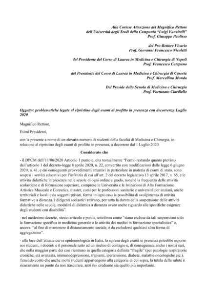 La circostanza più grave, tuttavia, è che sono state prese decisioni che riguardano direttamente gli studenti senza che costoro venissero interpellati, anzi, sono stati anche sostanzialmente ignorati quando hanno cercato di esporre le proprie ragioni. Lo scorso 15 giugno è stato inoltrato un documento (di cui inseriamo una copia alla fine dell’articolo), indirizzato al Magnifico Rettore, al Pro-Rettore Vicario, al Presidente del Corso di Laurea in Medicina e Chirurgia di Napoli, al Presidente del Corso di Laurea in Medicina e Chirurgia di Caserta e al Preside della Scuola di Medicina e Chirurgia in cui si chiedeva un ravvedimento in favore dello svolgimento degli esami “in via telematica fino al termine dello stato di emergenza fissato per il 31 Luglio 2020, come da precedente disposizione dell’Università stessa e nel rispetto dei decreti ministeriali” oppure, in alternativa, una comunicazione ufficiale “che attesti di andare contro il decreto vigente, di garantire il massimo della sicurezza possibile […] così da non incorrere nel rischio di scaricare agli studenti le eventuali problematiche”. Documento ufficiale chiesto allora affinché l’Università si assumesse le proprie responsabilità, data la posizione a quanto pare inamovibile che ha assunto, ma in tutta risposta è stato imposto agli studenti l’obbligo dell’autocertificazione.