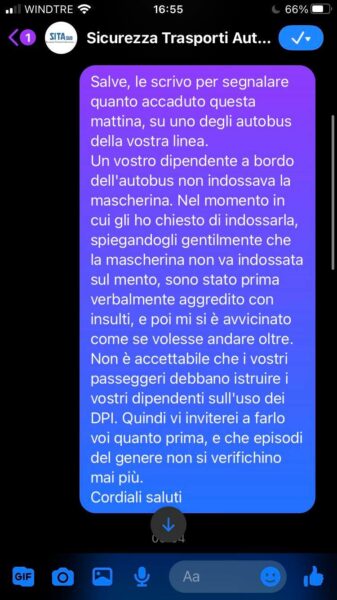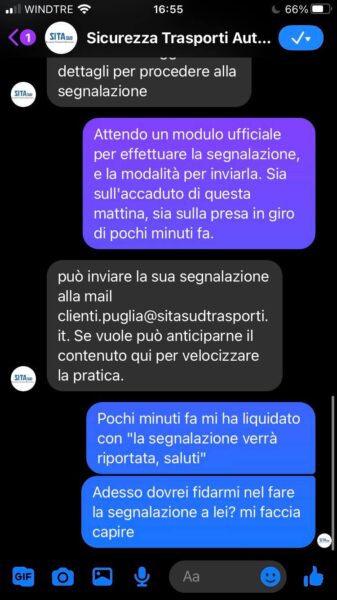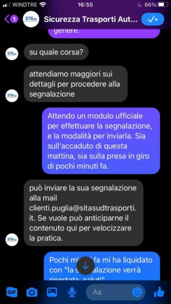La fiera delle assurdità però non è finita qui, poiché Guido ha contattato l’azienda tramite la pagina Facebook ufficiale per segnalare quanto accaduto e fare in modo che ai dipendenti fossero chiarite le regole anti contagio. L’addetto ai social gli ha inizialmente risposto in maniera sbrigativa, scrivendo che avrebbe inoltrato la segnalazione in modo che fossero presi provvedimenti, ma senza domandare quali fossero la linea e la corsa. Chiaramente, senza queste informazioni è impossibile per l’azienda approfondire la questione. La conversazione, come si vede dagli screenshot allegati, è continuata senza portare a una conclusione. Guido ha autonomamente trovato un indirizzo email dove ha inoltrato la segnalazione.