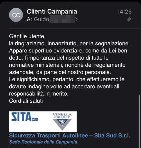 L’azienda di trasporti, contattata da chi scrive per ricevere una risposta ufficiale, ha così risposto alla richiesta di rilasciare una dichiarazione ufficiale: “Gentile utente (scrivono ‘utente’ seppure abbia precisato di averli contatti in quanto giornalista, ndr), la ringraziamo, innanzitutto, per la segnalazione. Appare superfluo evidenziare, come da Lei ben detto, l’importanza del rispetto di tutte le normative ministeriali, nonché del regolamento aziendale, da parte del nostro personale. Le significhiamo, pertanto, che effettueremo le dovute indagine volte ad accertare eventuali responsabilità in merito. Cordiali saluti”.