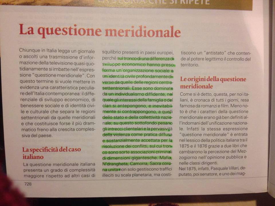La studentessa napoletana Camilla R. ha segnalato alla pagina Facebook Briganti quanto riportato dal proprio libro di testo, “La discussione storica” stampato da Edizioni Scolastiche Bruno Mondadori. Il capitolo dedicato alla questione meridionale si apre con un’introduzione che ha sdegnato la ragazza, soprattutto perché si tratta di parole scritte da persone che hanno alle spalle titoli accademici e anni di studio: