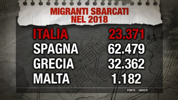 Passiamo ad un altro dato: i migranti sbarcati nel 2018. Salvini, pur essendo al Governo da circa 7 mesi, continua a millantare meriti che evidentemente non sono soltanto suoi. Infatti, se l’Italia è tra i paesi che fa registrare il minor numero di entrate (23.371 migranti) il merito non è soltanto del Governo del “cambiamento”, ma anche di quello precedente che ha siglato un accordo con le autorità libiche. Come riportano dati del Viminale, gli sbarchi sono calati dell’80% nel primo semestre 2018 (rispetto allo stesso periodo del 2017), ma sono nuovamente aumentati con l’insediamento del nuovo esecutivo che ha portato ad una destabilizzazione temporanea degli accordi.