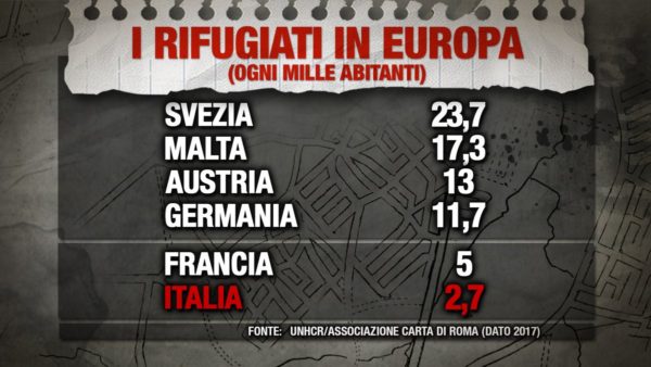 Partiamo dal numero di rifugiati ogni mille abitanti. In testa a tutte tra le europee c’è la Svezia con circa 24 rifugiati, seguita a ruota da Malta e dall’Austria. L’Italia, invece, con circa 3 rifugiati è dietro anche alle odiate (da qualcuno) Germania e Francia, rispettivamente con 11,7 e 5. I dati diffusi da Unchr parlano chiaro: se proprio si deve parlare di “invasione” la cosa riguarda solo in minima parte il Belpaese.