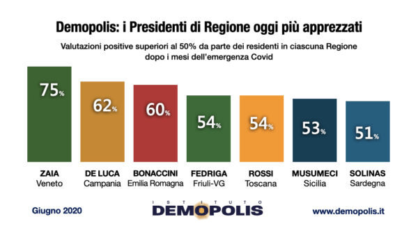 L’indagine, realizzata per il programma Otto e Mezzo, ha messo in luce i dati relativi ad ogni singola regione italiana. Ad oggi sono sette i presidenti più apprezzati. Si legge sul sito di Demopolis:  Al primo posto, con il 75%, il Governatore del Veneto Luca Zaia, seguito al 62% dal Presidente della Campania Vincenzo De Luca. Sul podio del gradimento dei cittadini, rilevato da Demopolis, anche il governatore dell’Emilia Romagna Stefano Bonaccini con il 60%. Al 54%, alla pari, Massimiliano Fedriga del Friuli Venezia Giulia ed il toscano Enrico Rossi. Sesto posto, con il 53%, per il Presidente della Regione Siciliana Nello Musumeci, mentre ottiene il settimo posto il governatore della Sardegna Christian Solinas al 51%”.