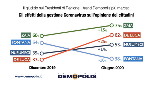 Demopolis: De Luca e Zaia sono i Presidenti di Regione più amati d'ItaliaDemopolis, l’Istituto Nazionale di Ricerche che studia le tendenze della società italiana, ha condotto uno studio per valutare l’apprezzamento verso i presidenti delle regioni dopo l’emergenza coronavirus. A livello nazionale è emerso che il 51% degli italiani ha fiducia nel proprio governatore, dato in salita di 9 punti rispetto al 42% del periodo pre Covid-19.