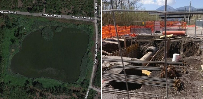 San Giuseppe Vesuviano è sicuramente una delle località che ha dovuto convivere con la situazione forse più problematica, ossia la tramutazione della vasca in località Pianillo, bacino artificiale progettato in epoca borbonica originariamente destinato al solo conferimento e assorbimento delle acque piovane, in una cloaca a cielo aperto la quale, oltre a provocare annose conseguenze relative all’inquinamento delle falde acquifere, all’insalubrità dell’aria e al mefitico olezzo che infestava l’intero areale, causava il trasbordo di numerosi quantitativi di acqua stagnante più a valle durante le giornate di pioggia, provocando spesso massicci allagamenti lungo le strade e le campagne limitrofe.