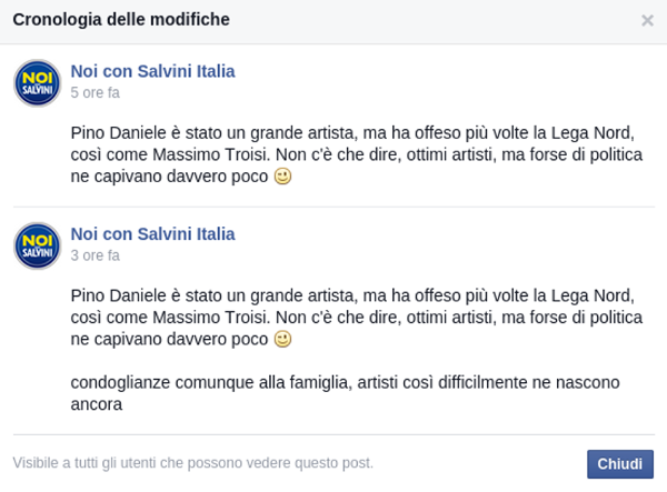 Due ore dopo i gestori della pagina hanno cercato di aggiustare il tiro aggiungendo le condoglianze alla famiglia, e un banale “artisti così difficilmente ne nascono ancora”: banale perché si tratta di un contentino per le centinaia di persone che protestavano, e il quale non tiene conto che Pino e Massimo sono grandi, ed amati, proprio perché pensavano in un determinato modo, erano dalla parte della propria gente, di Napoli, del Sud – a Pino Daniele e Massimo Troisi non poteva piacere la Lega Nord, e non fa niente se di politica non ne capivano.