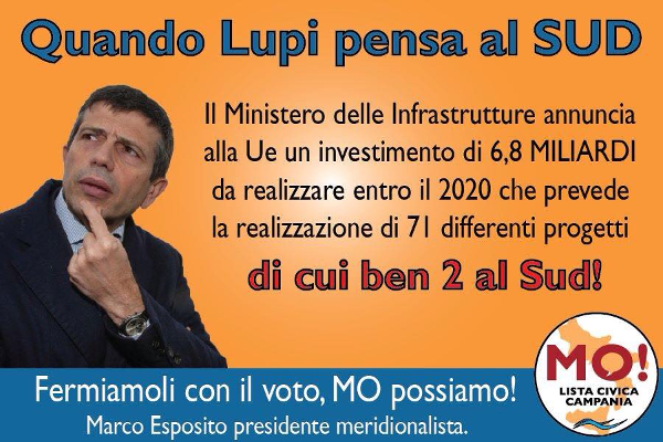 È la lista civica MO!, candidata alle prossime elezioni regionali, a denunciare l’accaduto. Le opere ritenute fondamentali da finanziare e realizzare entro il 2020 con l’aiuto dell’Europa (2,5 miliardi su 6,8 complessivi), sono, infatti, tutte collocate al Nord ed al centro, che prendono il 99% delle risorse. Evidentemente l’ItaliaUnitaSPA ritiene che il Sud sia già sufficientemente sviluppato, tanto da non aver bisogno di vedere le proprie infrastrutture potenziate.